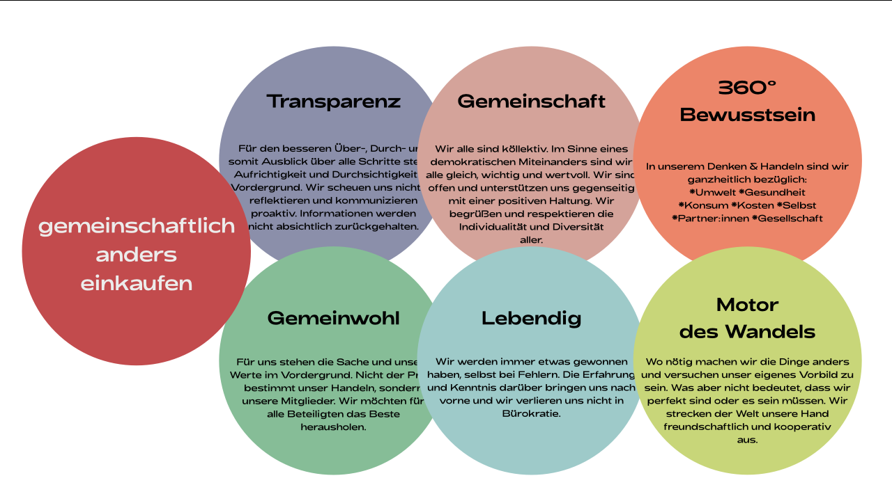 An diesen Werten orientieren wir uns auf dem Weg unsere Vision "gemeinschaftlich anders einkaufen" Wirklichkeit werden zu lassen.